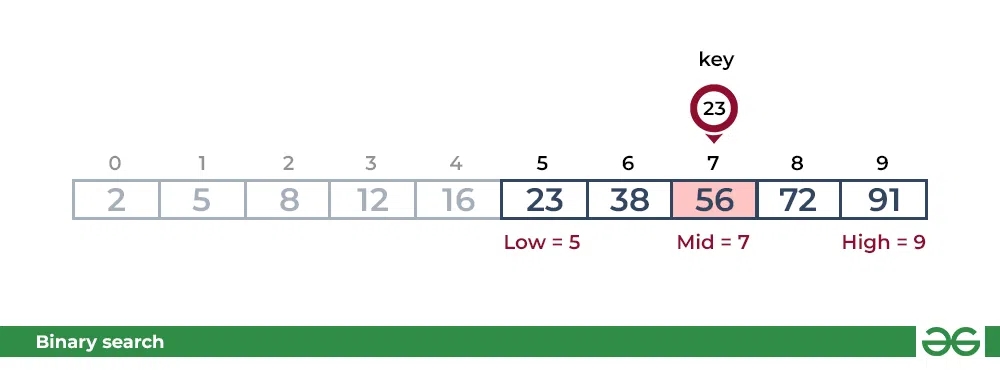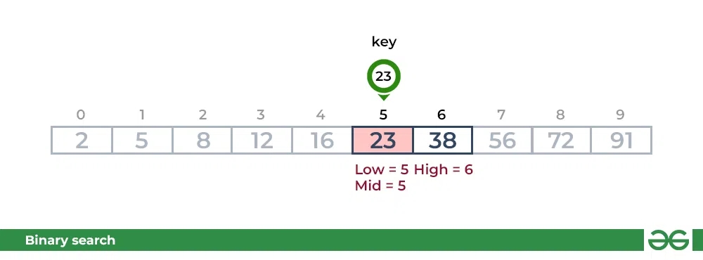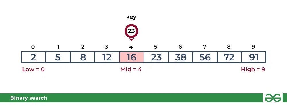 Binary Searchning ishlashini tushunish uchun quyidagi rasmni ko'rib chiqamiz: []arr = {2, 5, 8, 12, 16, 23, 38, 56, 72, 91} massivni va key = 23 ni ko'rib chiqamiz.