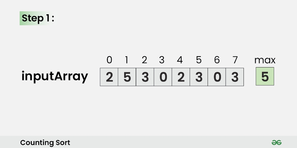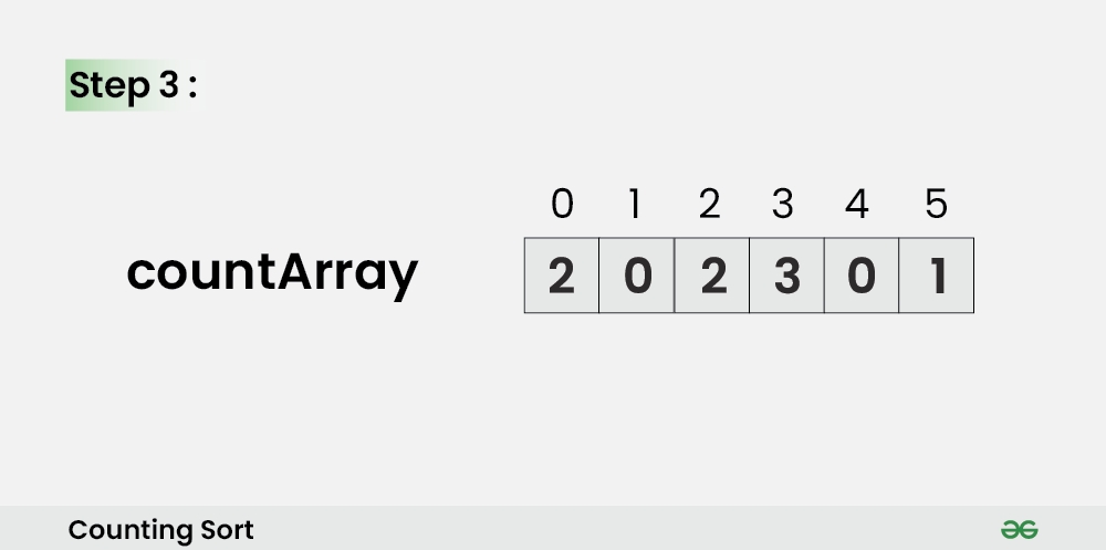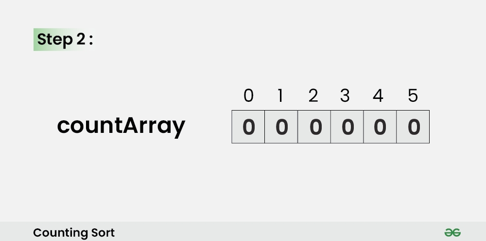 Uzunligi max+1 bo'lgan countArray[] ni barcha elementlari 0 sifatida ishga tushuring. Ushbu massiv kirish massivining elementlarining paydo bo'lishini saqlash uchun ishlatiladi.
