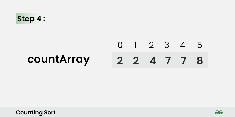 ni bajarib, countArray[] elementlarining yig'indisi yoki prefiks yig'indisini saqlang. Bu kirish massivining elementlarini chiqish massividagi to'g'ri indeksga joylashtirishga yordam beradi.
