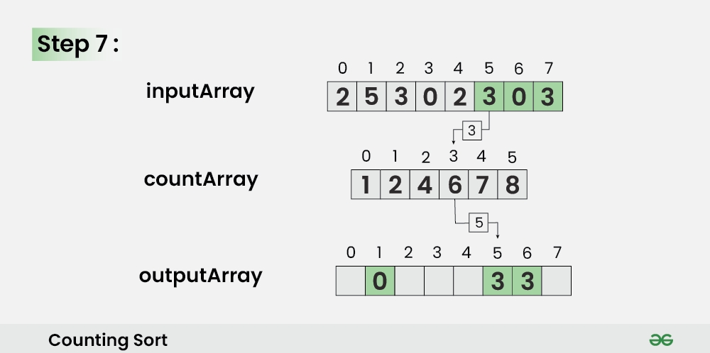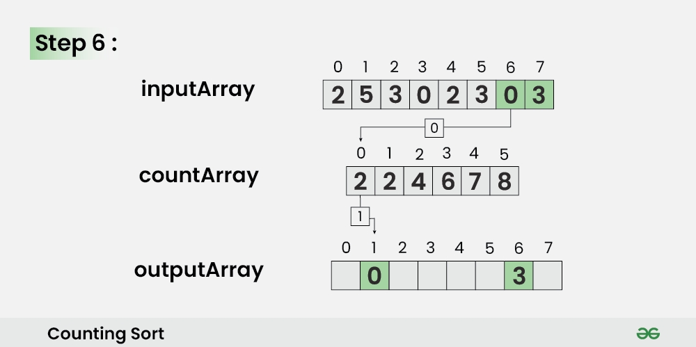 , outputArrayni yangilang. Shuningdek,countArray[inputArray[6]] = countArray[inputArray[6]]--