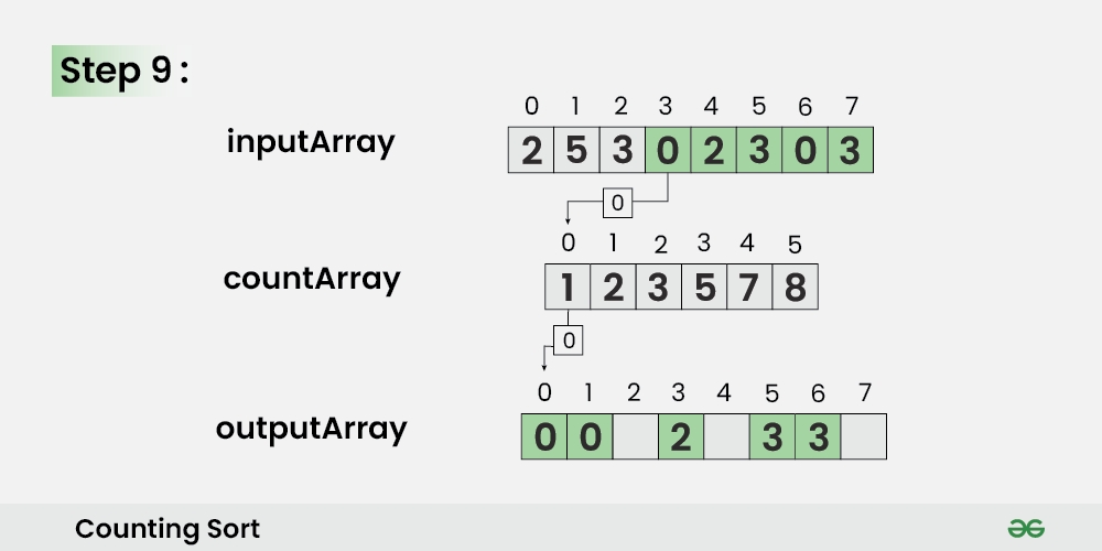, outputArrayni yangilang. Shuningdek,countArray[inputArray[0]] = countArray[inputArray[0]]--