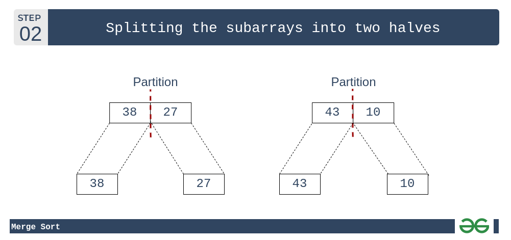 Massivni ko'rib chiqaylik []arr = {38, 27, 43, 10} Merge Sortni tushunish uchun quyidagi rasmlarga qarang.