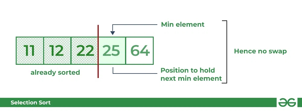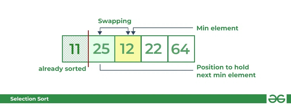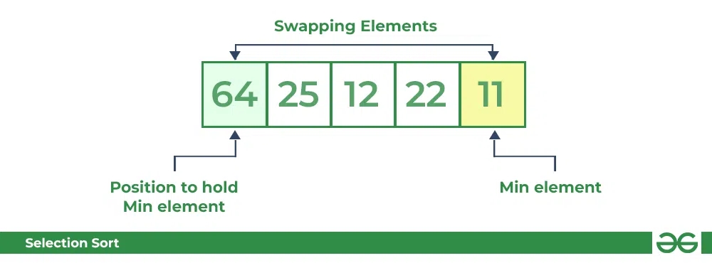 64saqlanadigan birinchi pozitsiya, butun massivni aylanib o'tgandan so'ng,11eng past qiymat ekanligi ayon bo'ladi.Shunday qilib, 64 ni 11 bilan almashtiring. Bir marta takrorlangandan so'ng, massivdagi eng kichik qiymat bo'lgan 11 tartiblangan ro'yxatning birinchi pozitsiyasida paydo bo'ladi.