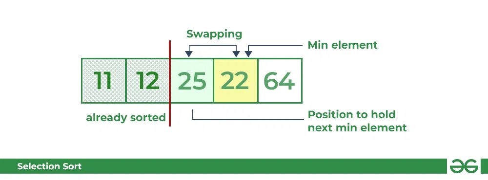 22uchinchi eng kam qiymat bo'lib chiqdi va u massivda uchinchi o'rinda paydo bo'lishi kerak, shuning uchun22ni uchinchi o'rindagi element bilan almashtiring.